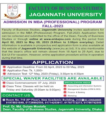 ==Faculty of Business Studies, Jagannath University invites applications for admission in the MBA (Professional) Program, Fall-2023. Application form can be collected and submitted to the office of the Dean, Faculty of Business Studies or through online at www.embajnu.com during the period from April 02, 2023 to May 09, 2023 (9.00 am to 3.00 pm everyday).